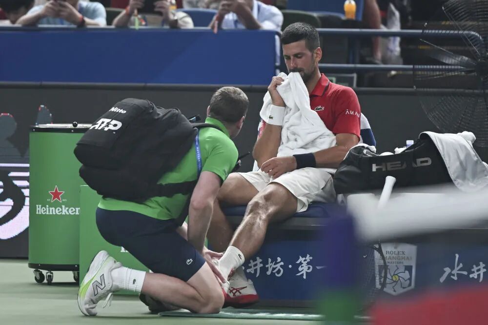 △ 10月7日,德约科维奇在比赛中接受治疗。新华社记者 陈浩明 摄